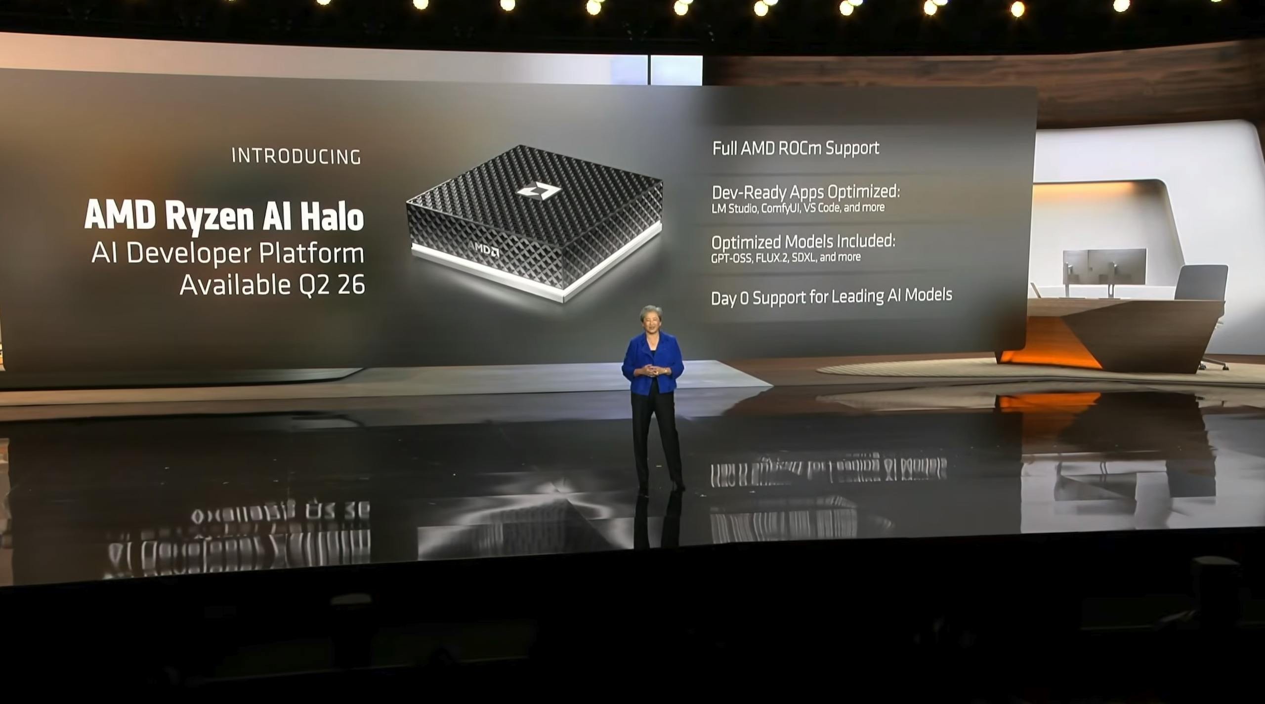 蘇指出,ROCm 獲得 PyTorch、vLLM、SGLang、Hugging Face 等頂尖開源專案的原生支援,這些專案每月的下載量超過 1 億次,且 ROCm 不僅限於資料中心,此次 AMD 推出的全球最小 AI 開發系統 Ryzen AI Halo,也預載了最新的 ROCm 軟體棧。