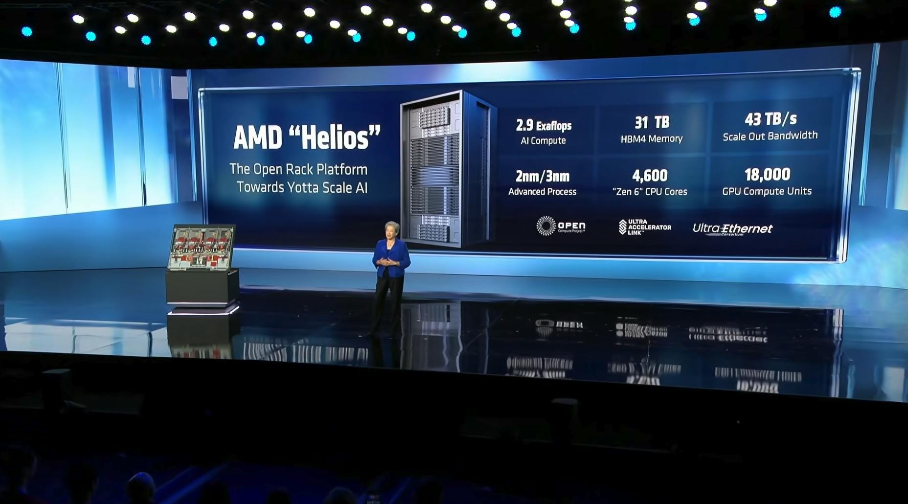每個 HELIOS 運算節點(Compute tray)整合了 4 個 MI455 GPU、次世代 EPYC Venice CPU(具備多達 256 個 Zen 6 核心)以及 Pensando 網路晶片。單一機架包含 72 個 GPU,透過高速協議(Ultra Accelerator Link)協作,可提供高達 2.9 Exaflops 的運算能力,全機採用水冷技術以極大化效能,並搭配 800G 乙太網路技術實現超高頻寬與超低延遲。