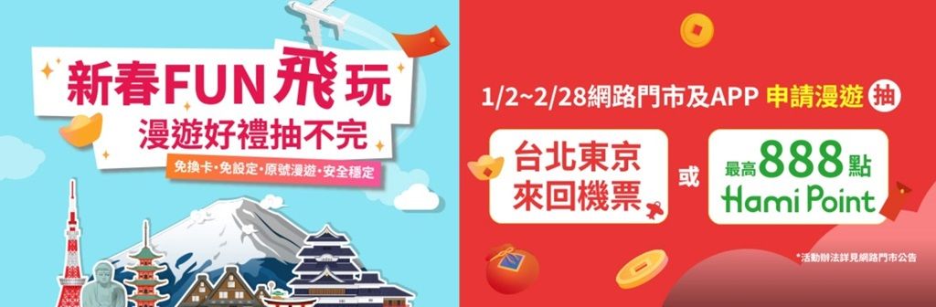 至2月28日,月租用戶網路或App申辦中華電信國際漫遊,抽東京來回機票。