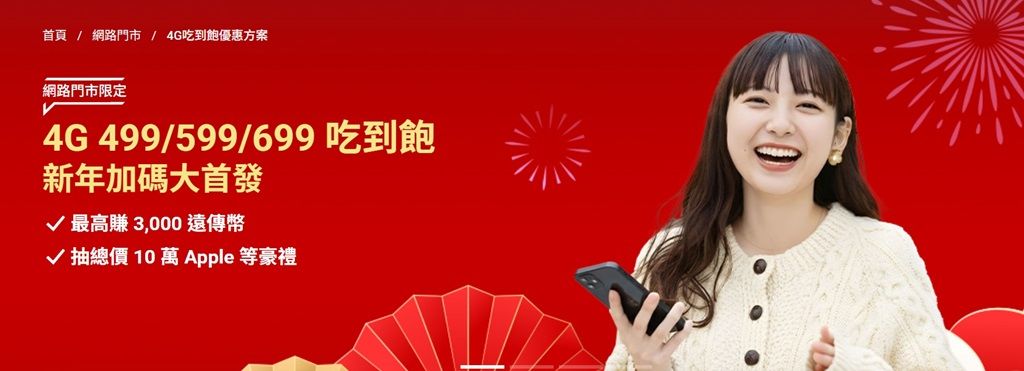 至1月31日,網路新申辦或攜碼申辦4G網路699元方案,贈最高4000點遠傳幣。