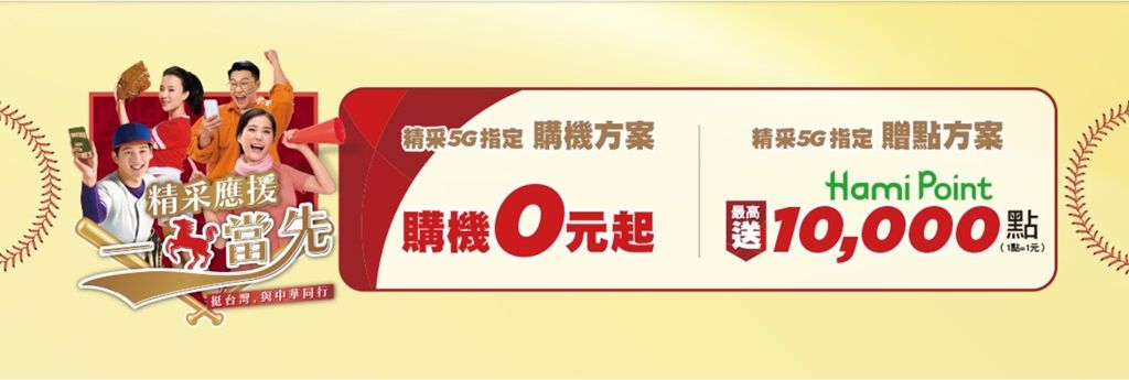 至3月31日,申辦精采5G指定贈點方案,贈最高1萬點Hami Point,持點數於商城兌換商品抽16888點數和7-11商品卡。
