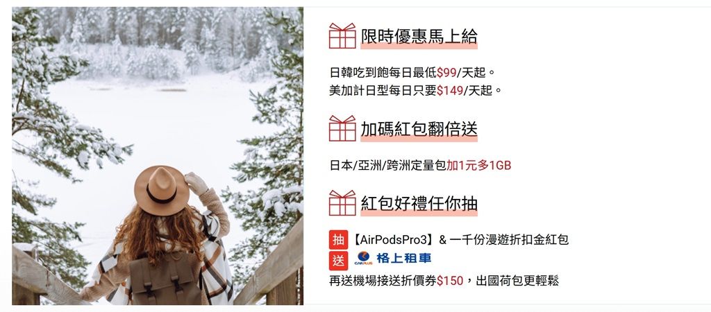 有出國旅遊需求者,遠傳電信推出國際漫遊限時加碼優惠,即日起至2月28日止,日韓網路吃到飽方案每日最低99元起、美加計日型方案每日最低149元,且申辦日本、亞洲、跨洲定量包指定方案可獲得加1元多1GB優惠。於活動時間內,遠傳電信月租用戶申辦並使用漫遊,可參加抽獎活動,獎項內容包括AirPods Pro 3、100元或50元漫遊折扣金。