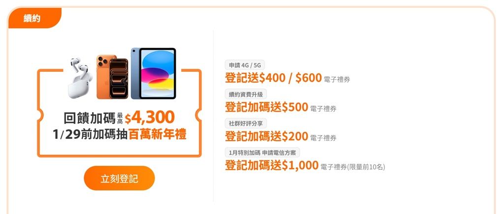至1月31日,續約且資費升級為指定方案,贈最高4300元電子禮券。