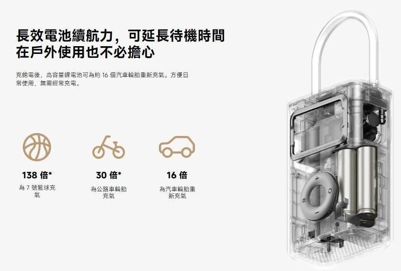 至於在續航力的部分,電池增大後,先前能打2.5個輪胎,現在能打3.7個輪胎,若換成籃球或單車輪胎則數量差距會更大。不過也因為缸體與電池增加,小米電動打氣機2 Pro的體積也比先前的產品更大,這點是較無法避免的物理限制。