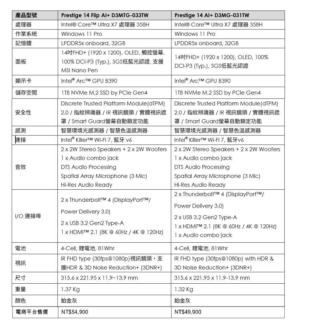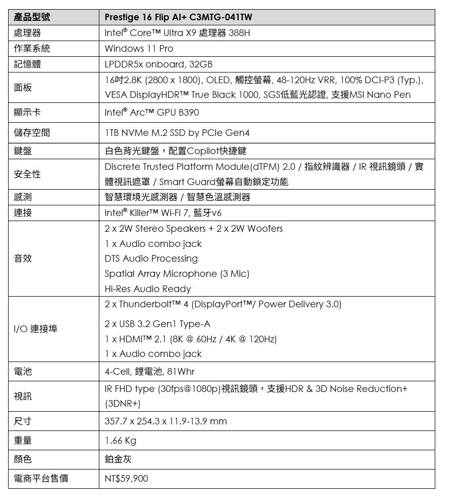 2026年式Prestige機型皆搭載Intel甫於CES公布的Core Ultra 300平台,搭配81Wh大容量電池可具備超過30小時的影片播放續航力,其中搭載Core Ultra X9與Core Ultra X7的機型具備12 Xe Core的Intel Arc B390整合式GPU,不僅具備執行3A大作的效能,也能進行異構AI加速;微星更採用先進均溫版、雙風扇與內吹式散熱設計使2026年式Prestige具備出色的散熱性能,噪音也控制在30dB以下。