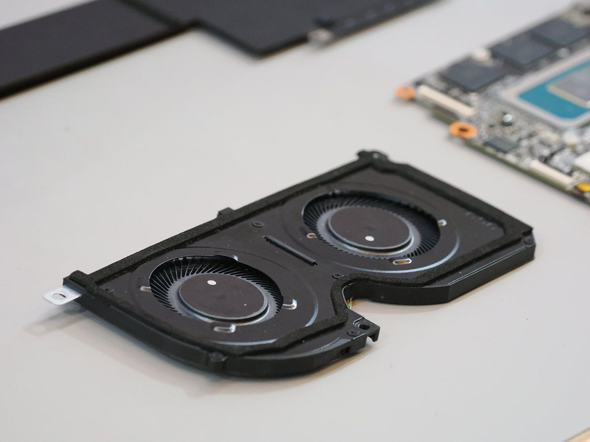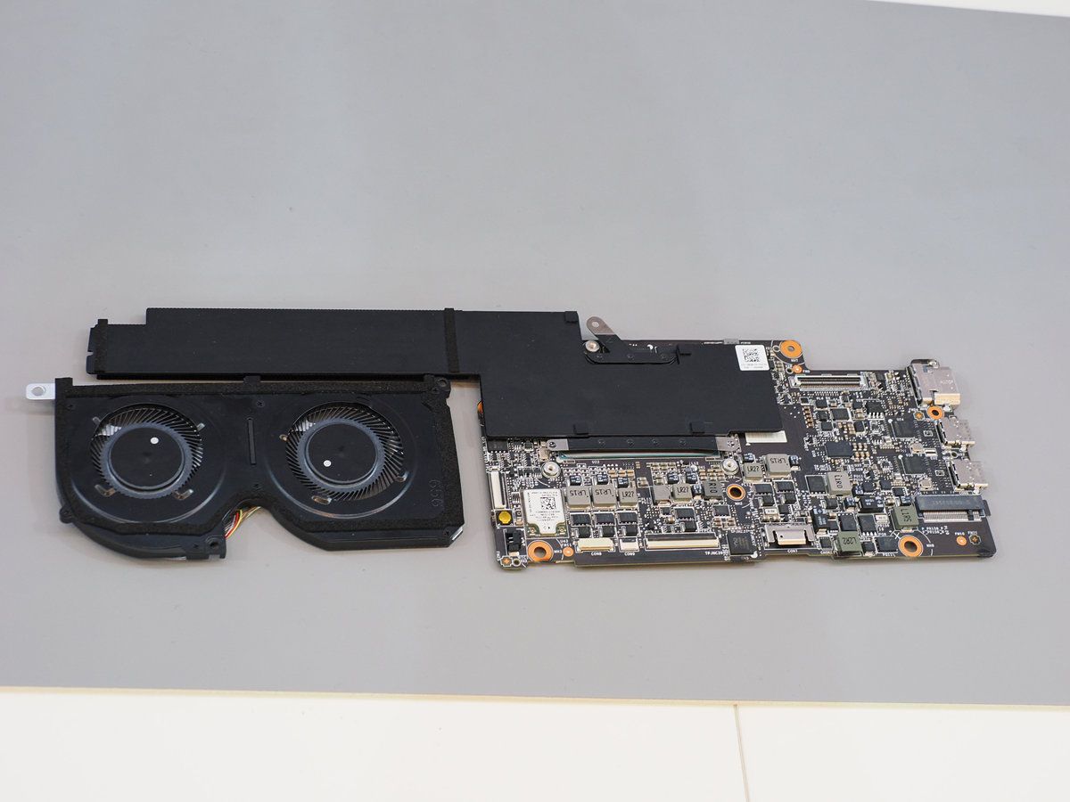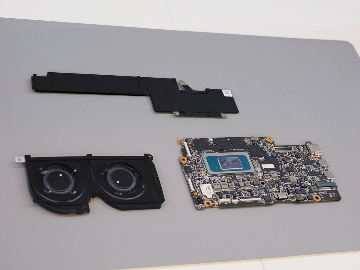 微星在現場也同步展出新款Prestige的散熱結構與主板設計,值得注意的是微星首次將內吹風扇與均溫板導入Prestige系列,均溫板有助建構纖薄、高效率的導熱結構,並透過雙風扇設計當中一路風扇向內吹拂,可有效透過氣流為主板上LPDDR記憶體、被動元件、SSD等內部關鍵組件降溫,使系統更為穩定。