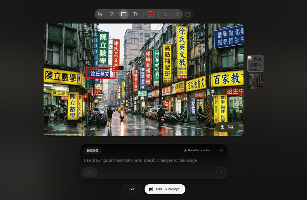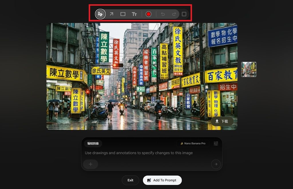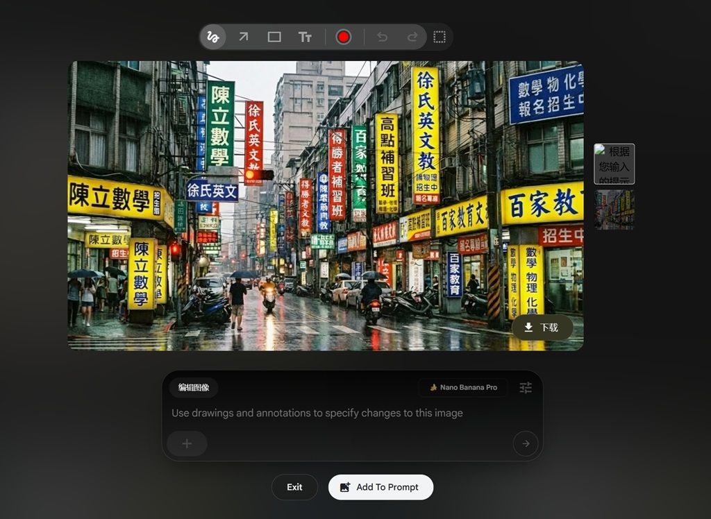 就和Gemini相同,Flow繪製的圖片同樣可以下指令修改,且Flow提供多項工具,用戶可以將想要修改的部分用框線圈起或是用箭頭標記。經過實測,Flow可以理解並精準修改標示的部分,不過繪製成果仍然會有些不穩,用戶可以分步驟多次修改,或者是先將圖片下載後再開啟新對話上傳修正。