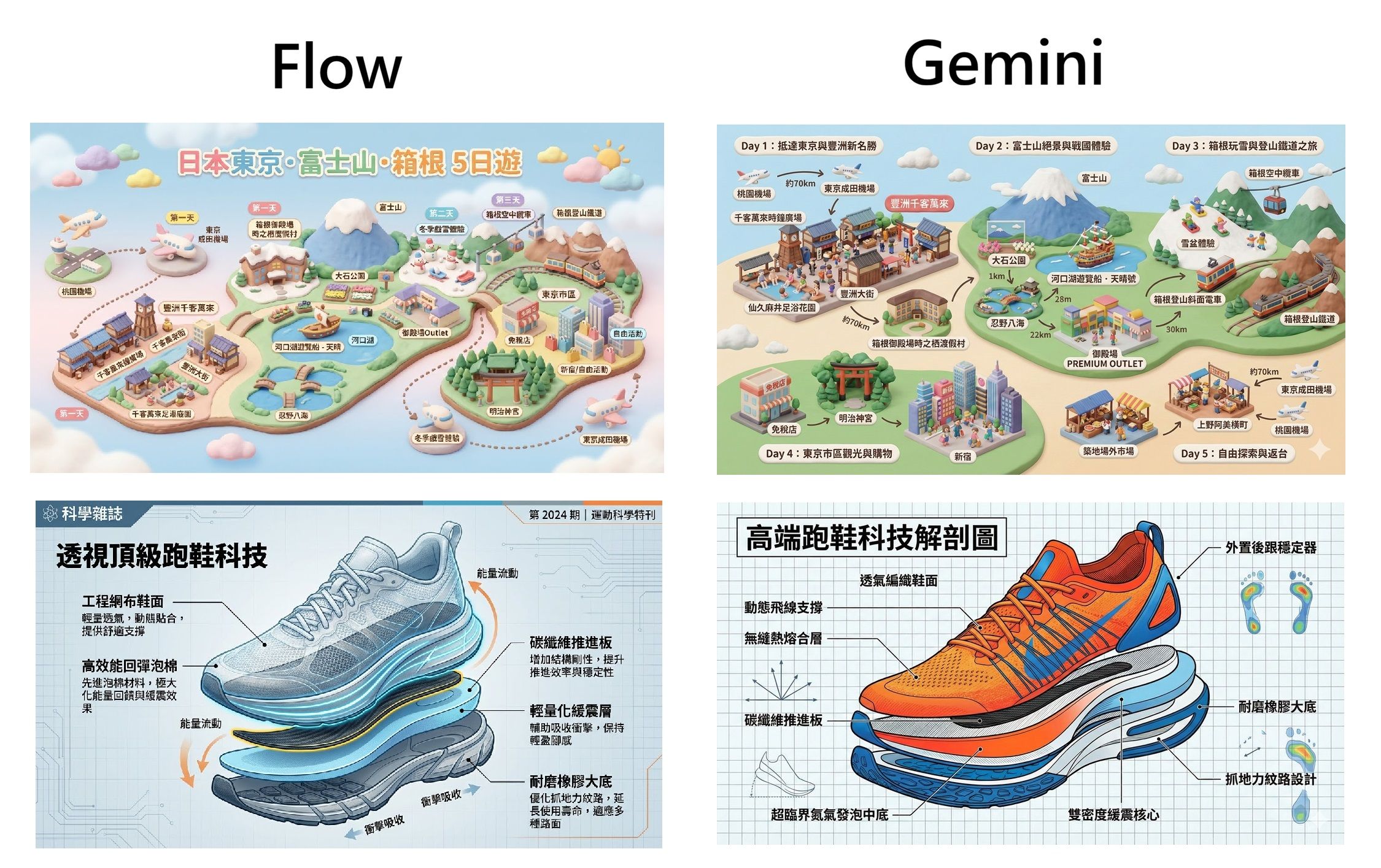 有別於Gemini繪製圖片1次指令1張圖的方式,Flow每次下達指令可以繪製最多4張圖片,且圖片無浮水印,也不需要消耗點數,就算是免費版用戶也能夠使用這項功能。Flow可以理解繁體中文指令詞並回答出符合需求的答案,即使是較複雜的指令例如繪製資訊圖表、繪製旅遊行程等也都可以完成,但可能是因為需要繪製4張,因此繪製速度和Gemini相比較慢,且複雜指令繪製出的成果有時候會不如Gemini精緻。