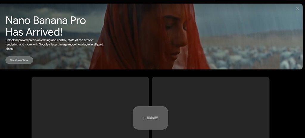 ▲Flow以製作影片為主,不過同樣支援圖片繪製功能,且可以使用Nano Banana Pro模型。選擇「新建項目」。