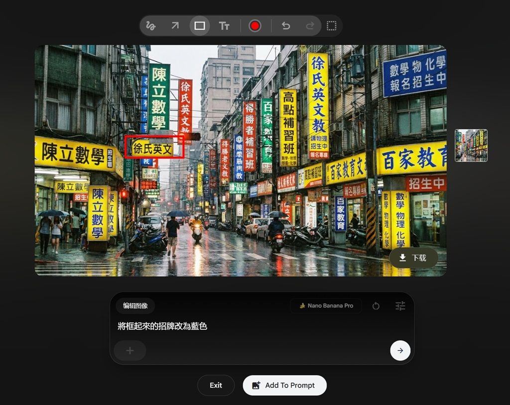 ▲以上圖為例,將黃色招牌用工具框起來,輸入提示詞希望將招牌更改為藍色。