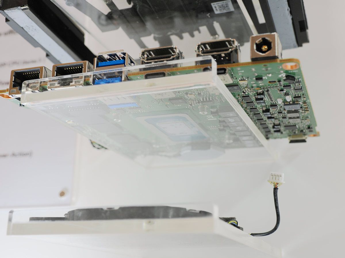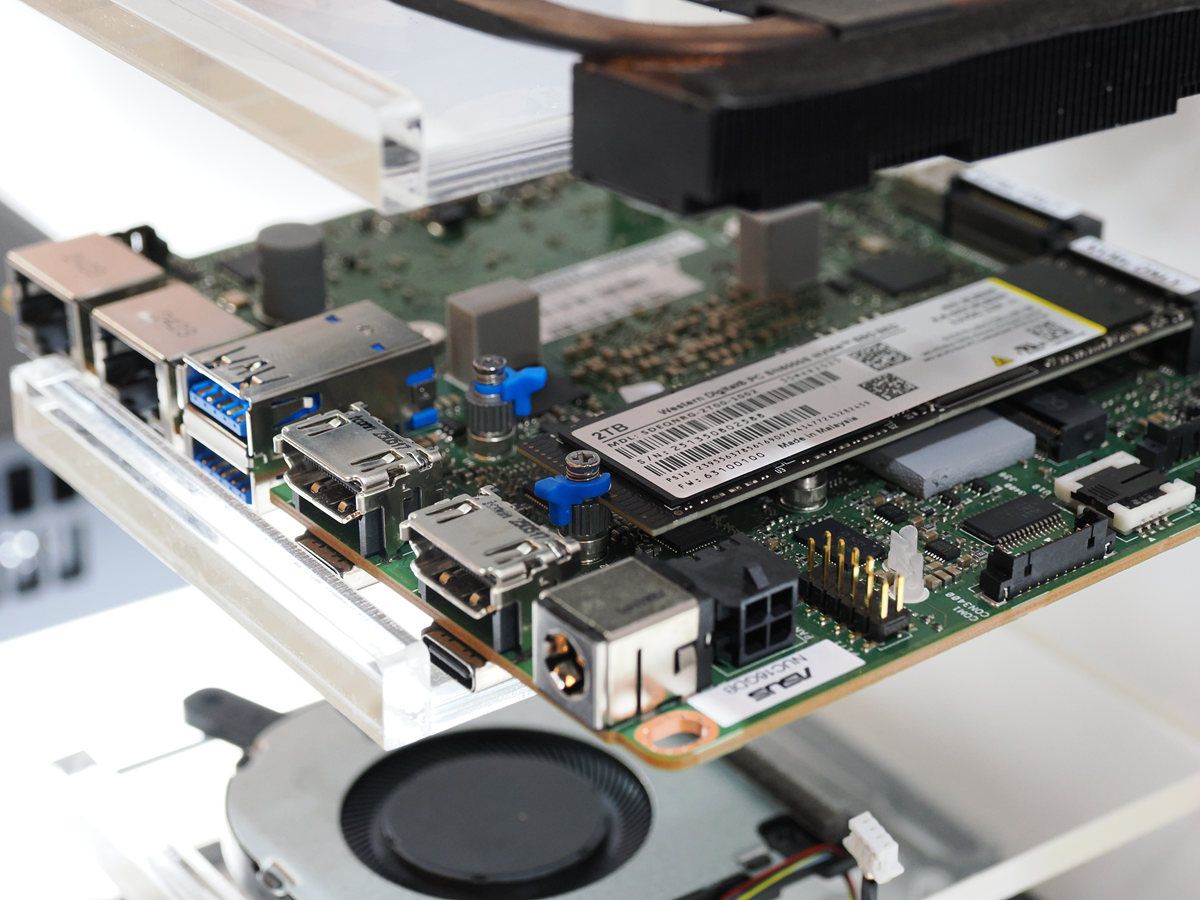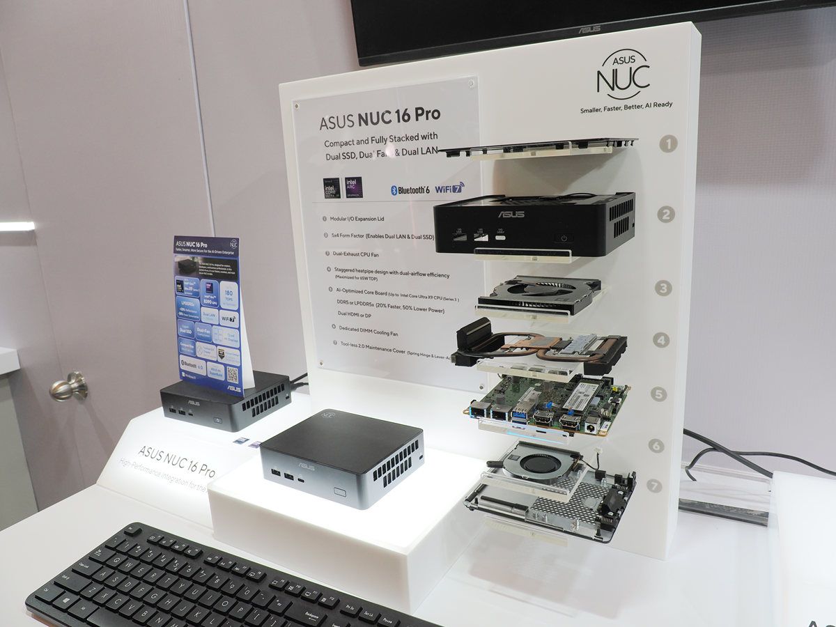 華碩的NUC 16 Pro延續系列簡潔的外型設計,除了強調免工具升級設計外,現場的機構爆炸圖可看到針對主板正反兩面的增強散熱設計,採用位於主機板頂部與底部的雙風扇設計,增強對主機板兩面元件的散熱,兩條M.2 SSD皆具有散熱片,並採用免工具扣具,處理器與記憶體則位於主板底部。