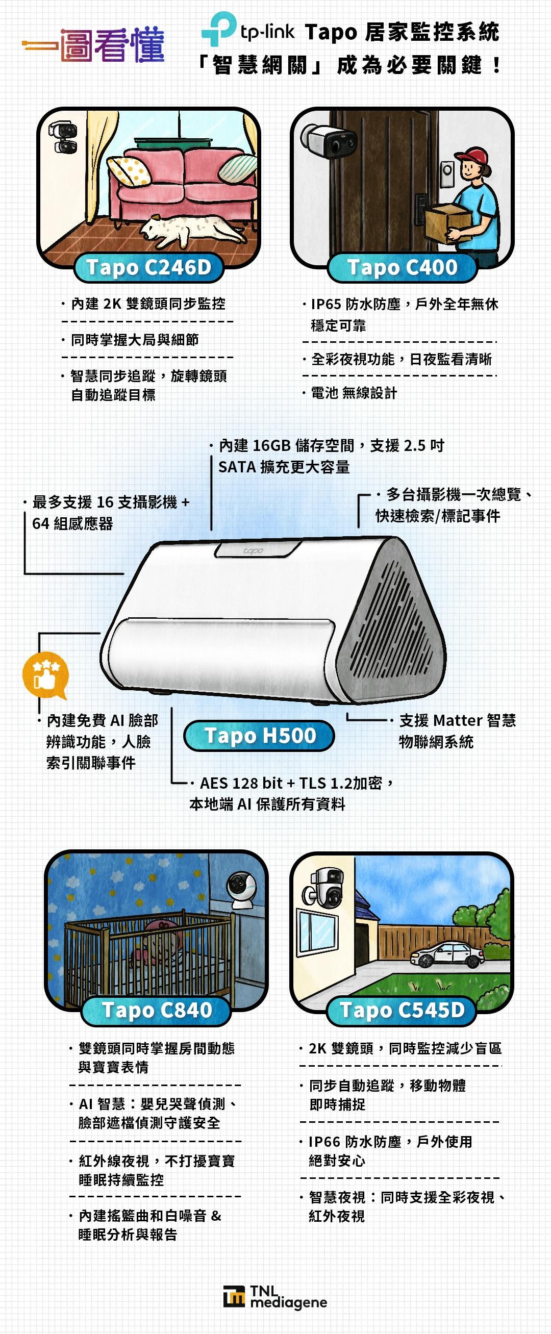 ▲ TP-Link Tapo 系列推出類型眾多的視訊攝影機,都能與 Tapo H500 智慧網關完美整合。/Photo Credit:TNL Brand Studio