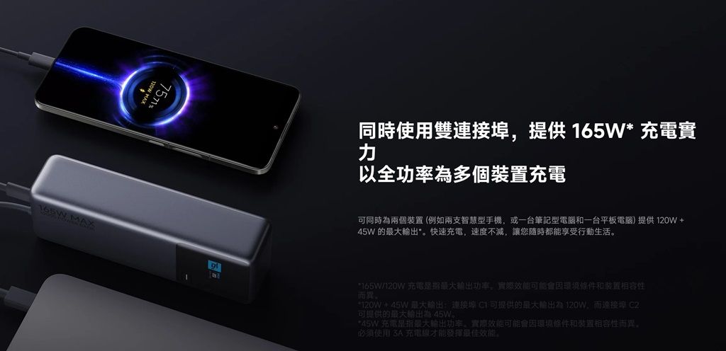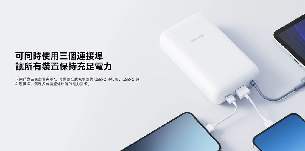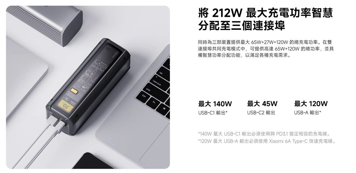 小米這款行動電源提供1個USB Type-C輸出埠、1條內建的USB Type-C線材,可以同時替2個裝置充電,且在2裝置同時充電的情況下可分別提供120W、45W功率。這款行動電源能夠滿足筆電和手機同時充電的需求,且內建線材,用戶不需要為了快充特地去多買1條充電線。另外,這款行動電源也有螢幕設計,可隨時掌握充電情況。