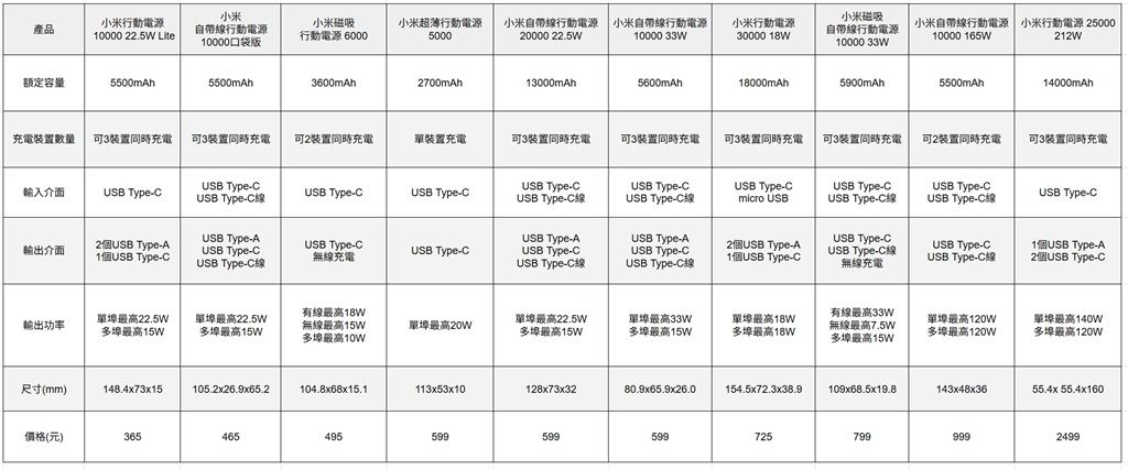 ▲小米行動電源規格整理表。詳細大圖可點此。
