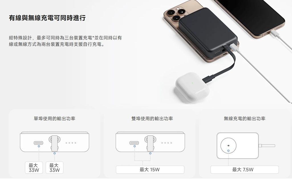 如果手邊有多個裝置例如手機、耳機、遊戲主機,並且想要盡可能減少帶在身上的線材,那麼小米這款行動電源可以滿足需求。行動電源支援無線充電並內建線材,因此在有3個裝置需要充電的場合,用戶也只要另外攜帶1條充電線就能夠搞定。在充電功率上,有線充電支援最高33W、無線充電支援最高7.5W功率,雖然無線充電速度不算快,但支援多種充電模式是最大優勢。