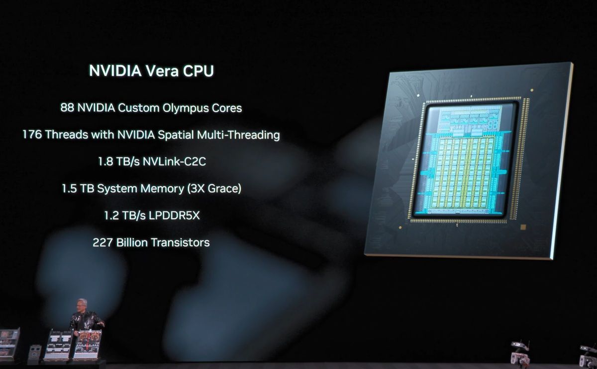NVIDIA於2026年CES的主題演講由執行長黃仁勳再次為Vera Rubin運算平台預熱,值得注意的是雖然NVIDIA已經與Intel宣布合作,Intel將開發支援NVLink的x86 CPU與NVIDIA平台接軌,不過NVIDIA的Arm指令集第二世代資料中心處理器Vera卻野心勃勃的把Arm指令集資料中心CPU擴大到「空間多執行緒」,是類似x86常見的「超執行緒」但又略有不同的多執行緒技術,使Vera能擴展至176個執行緒;。