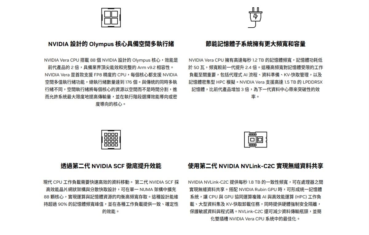 畢竟Vera Rubin平台將是NVDIA在2026年GTC的重頭戲,目前NVIDIA還未在官網提供白皮書,對於Vera僅有較為基本的描述;但若對比資訊,即可看到NVIDIA強調Vera的88核CPU是由NVIDIA設計、基於Arm v9.2指令集的Olympus核心,號稱效能可達Grace的兩倍(備註:Arm稱Neoverse V3「每插槽效能」高於Neoverse V2 50%),且每個核心都支援「空間多執行緒」功能。