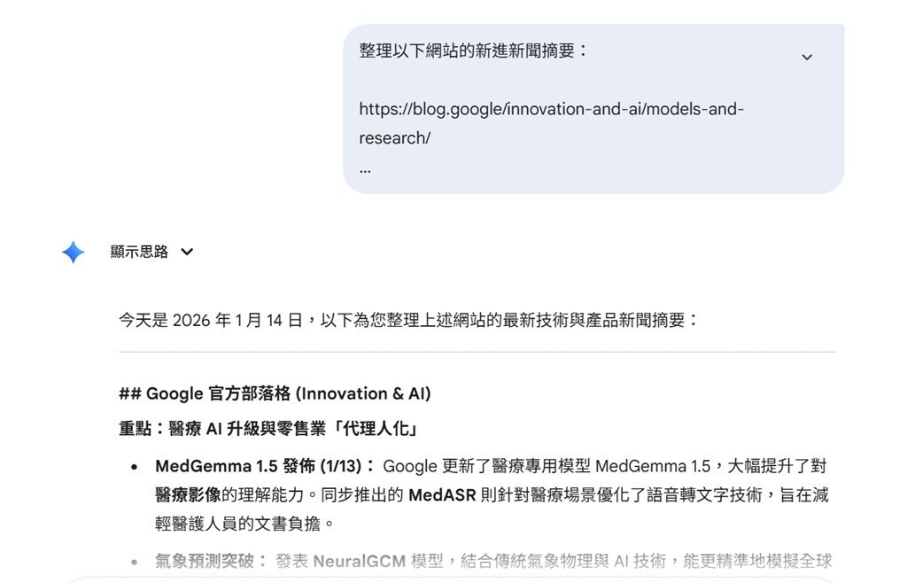 ▲過往想要知道偶像的相關報導,用戶需要用Google搜尋或是前往不同新聞網站慢慢翻找,如果是國外網站還會遇到翻譯問題。如今只要將新聞網站一同交給Gemini,Gemini就會自行從指定的新聞網站中篩選出與偶像有關的報導內容,並以繁體中文摘要。