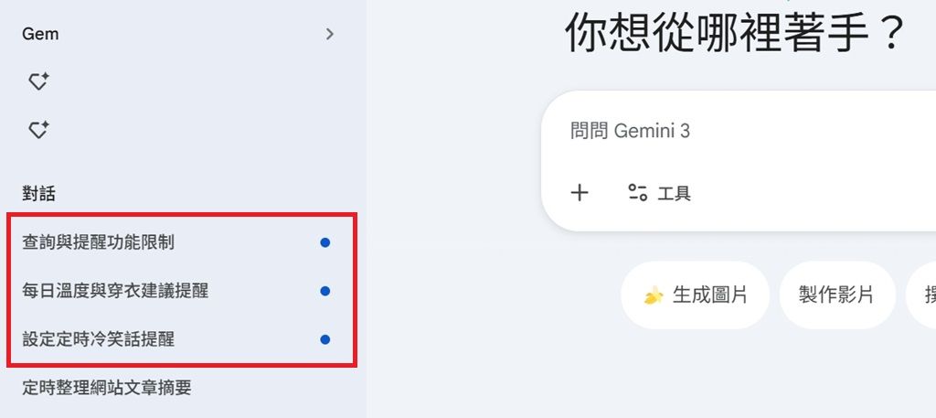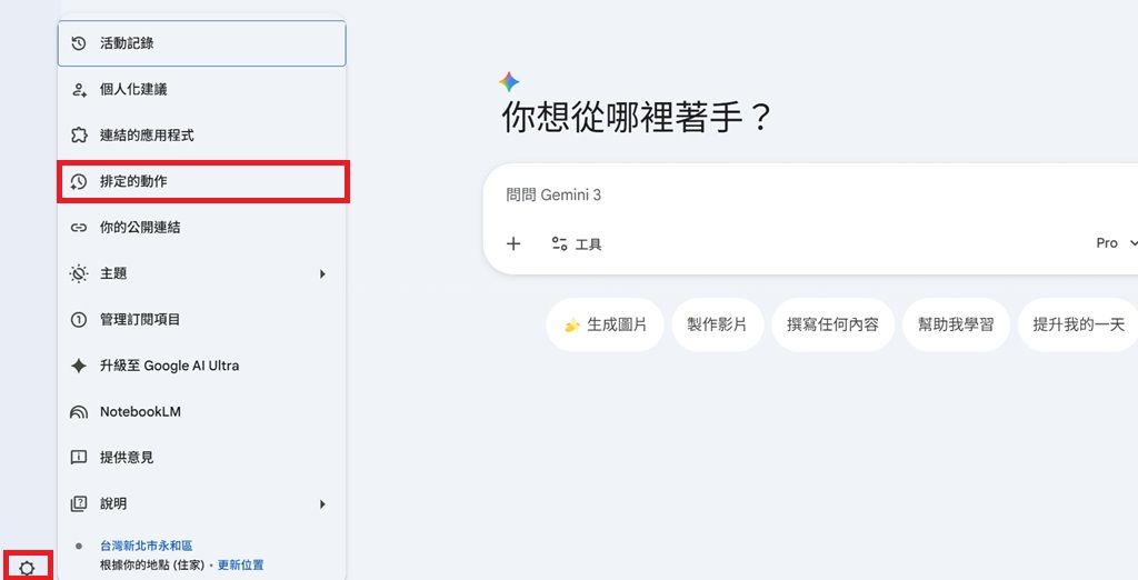 ▲如果用戶想要知道Gemini是否支援排定動作功能,可以點選左下角選項打開功能選單,查看是否有「排定的動作」選項。