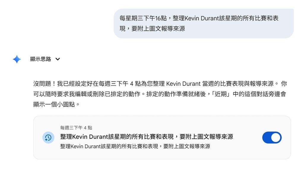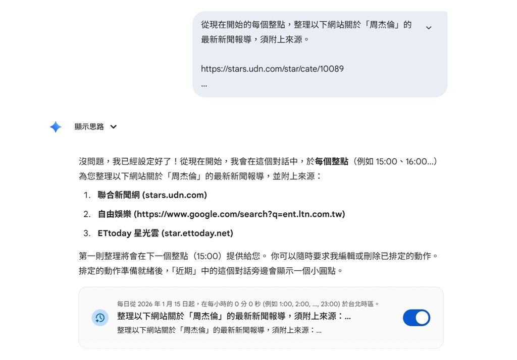 ▲如果偶像目前是關注焦點,用戶也可以要求Gemini每隔半個小時或1個小時就整理一次最新資訊,確保能夠第一時間看到與偶像有關的報導。