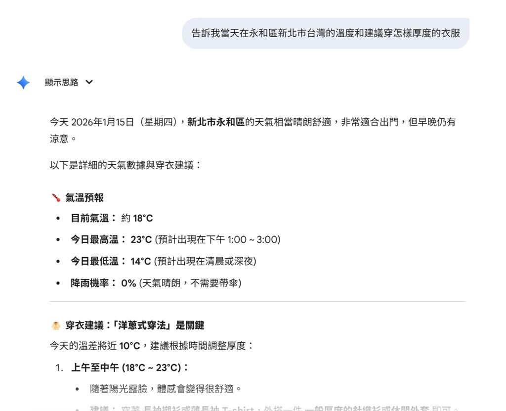 ▲在日常生活方面,用戶可以要求Gemini每日上午推送一則天氣預報和穿衣建議,Gemini也會整理當天不同時段的溫度預測。
