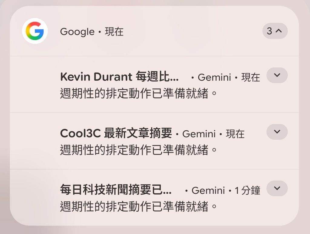▲Gemini會在設定的時間自動發出提問,等到答案準備好之後主動通知用戶可以前往查看。因為每個提問的回答時間不同,因此用戶可能會需要等待3至5分鐘才能得到回覆。