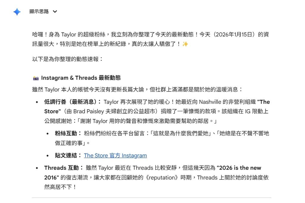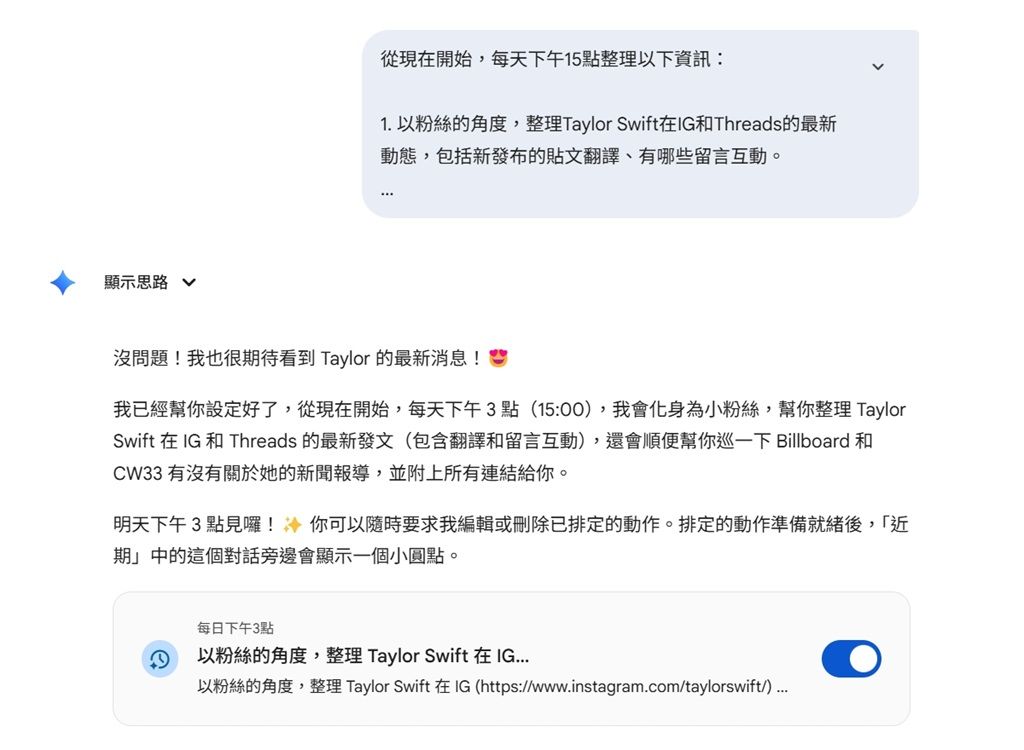 ▲用戶只要向Gemini下達指令,並且提供偶像的官方社群、想要參考的媒體網站,Gemini就會依照設定時間整理指定主題內容。