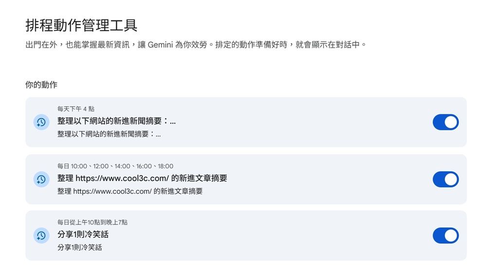 不論是想要讓Gemini化身為追星、追股票還是追遊戲的工具,用戶可以使用Gemini的「排定的動作」功能,讓Gemini在指定時段自動開始整理資訊,並主動告知用戶整理好的結果。這個功能可以藉由對話向Gemini下達指令開啟,而在設定好排定動作後,用戶也可以隨時前往設定選單暫停行程,或是直接刪除對話來刪除此設定。