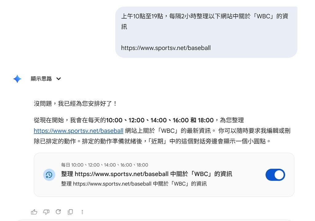 ▲用戶可以條列網頁,要求Gemini定時整理特定主題資訊,隨時掌握比賽、重大消息的最新訊息。