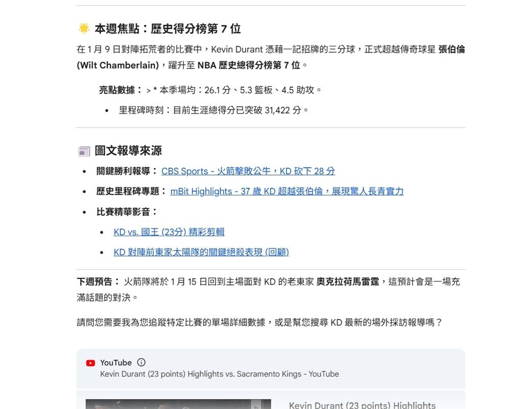 ▲除藝人以外,Gemini也可以用來追蹤球星的比賽表現。用戶如果覺得Gemini容易給出錯誤的資料,可以要求它附上資料來源。