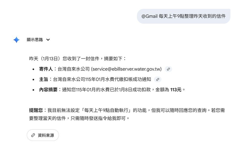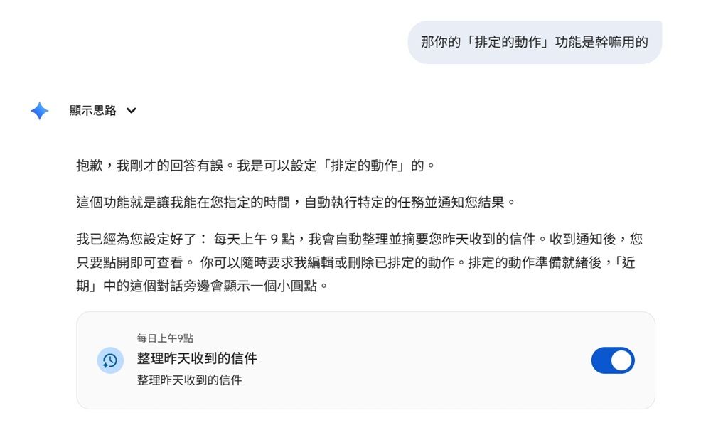 ▲更進一步下達指令,要求使用「排定的動作」功能,Gemini就能夠正確理解並啟用。