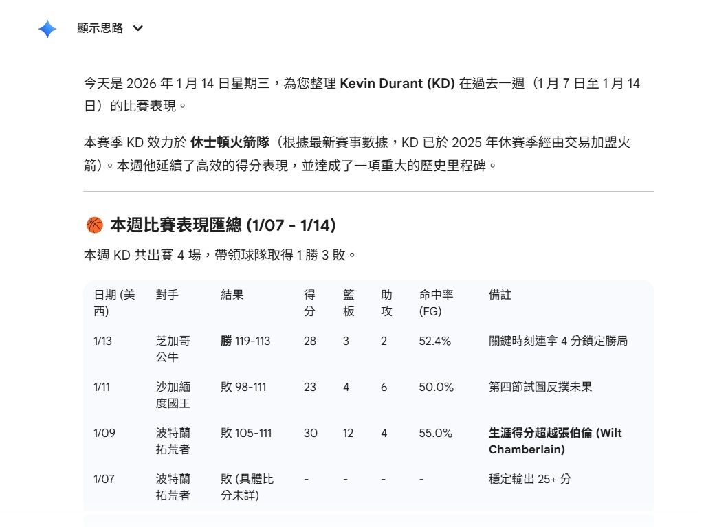 ▲Gemini將整理球星的賽程表、比賽重點和結果,並自動繪製表格。