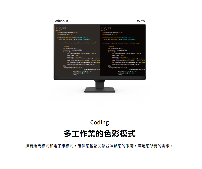 GW2790Q主打的是文書作業用途,有低藍光模式,以及少見的編碼模式與電子紙模式。編碼模式適合用於工程師撰寫程式碼,能夠較舒服閱讀色彩與文字。而電子紙模式則是專門為了黑白閱讀而設計,可模擬電子紙的效果,提升閱讀體驗。