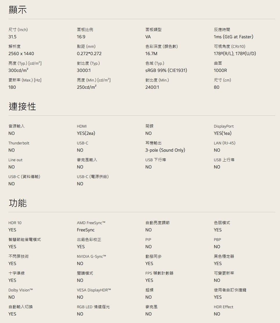 LG這款螢幕型號為32G600A-B,是32吋的曲面螢幕機種,而非平面螢幕這點需要注意。其螢幕曲度為1000R,而在更新率方面則是最高可達180Hz、反應時間則是1ms,已是這等級螢幕的高標準。