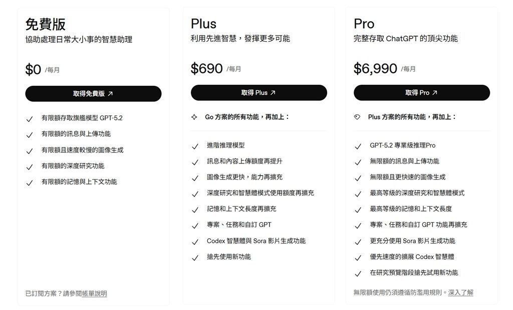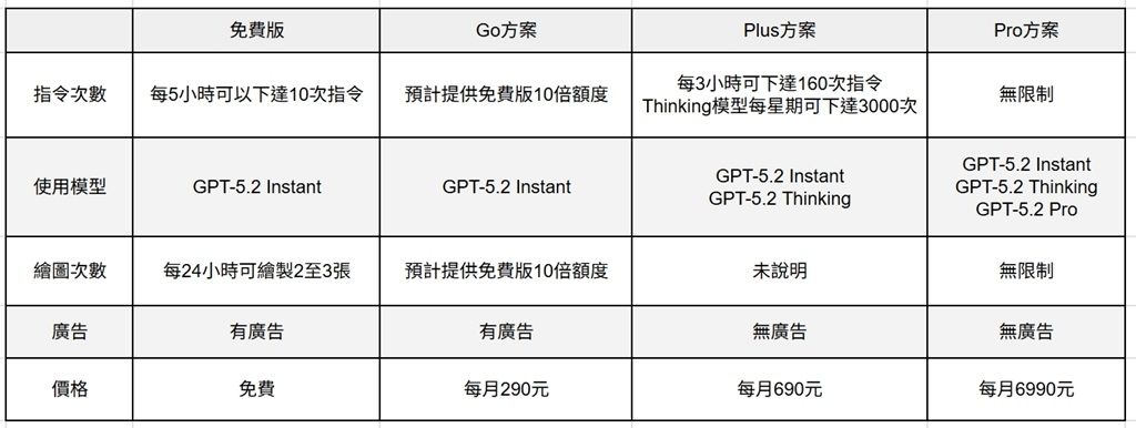 在以上方案以外,ChatGPT近期推出每月290元的Go方案,預計將提供比免費版多10倍的訊息、檔案上傳與圖像生成額度,不過確切額度尚未公告。ChatGPT Go方案將以GPT-5.2 Instant模型為主,並未提供GPT-5.2 Thinking模型的使用權限,且未來有計畫推出測試廣告,至於ChatGPT Plus、Pro方案都將維持無廣告體驗。
