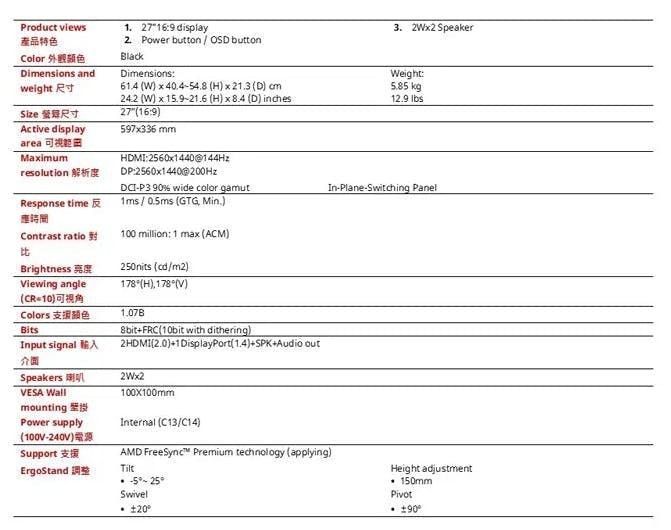 27吋/2K/200Hz/0.5ms/HDMI/DP/IPS
