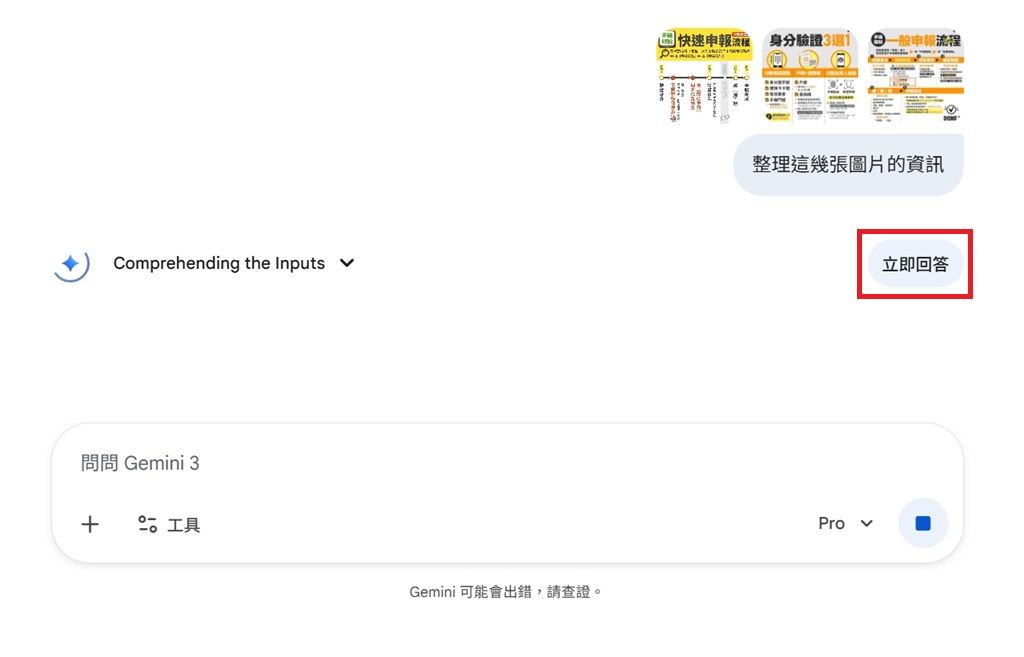 ▲用戶在送出提示詞後,等待約3至5秒就能夠看見「立即回答」的功能選項。在選擇立即回答後,用戶只要再等待2至3秒就能夠看到Gemini開始回應。