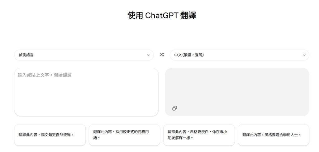 ▲ChatGPT翻譯介面與Google翻譯相似,同樣左側欄位輸入翻譯內容、右側欄位輸出翻譯成果。