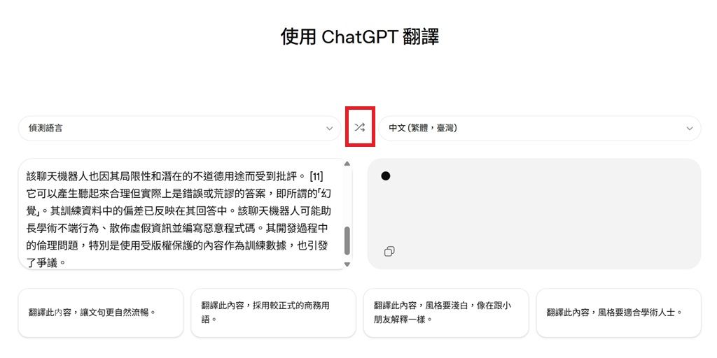▲如果是長篇文章,ChatGPT翻譯可能會需要超過3秒才能夠輸出答案,且在等待翻譯的過程中無法更改語言,須等待翻譯完成才能進行下一步操作。另外,與Google翻譯不同,用戶無法點按中間的按鍵調換左右側翻譯語言。