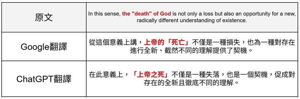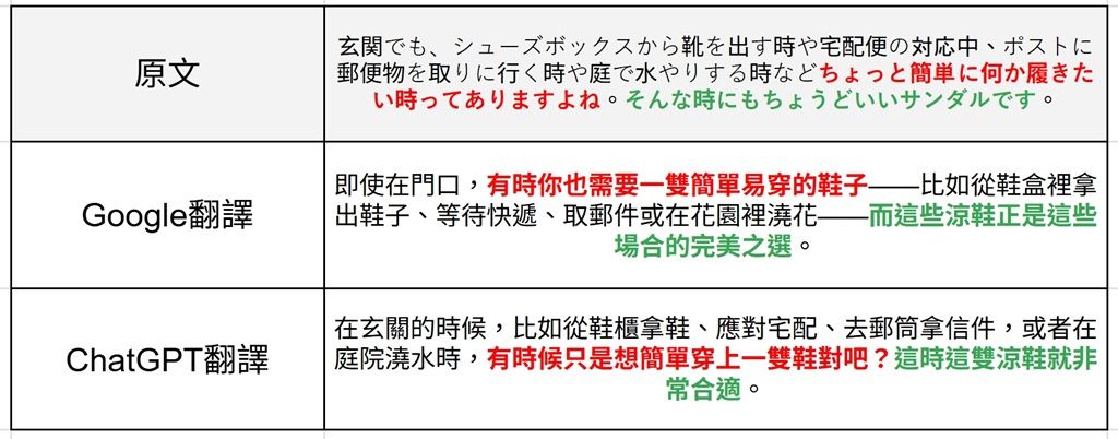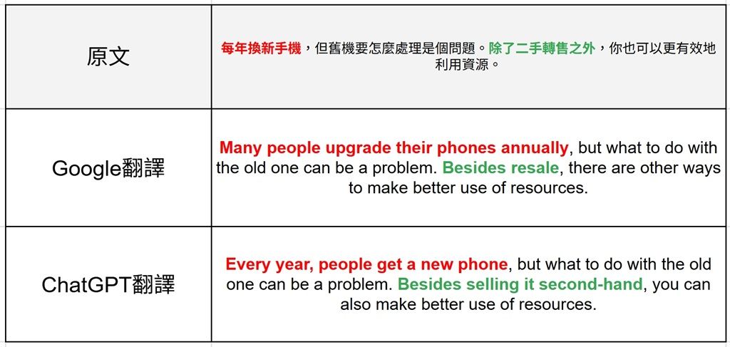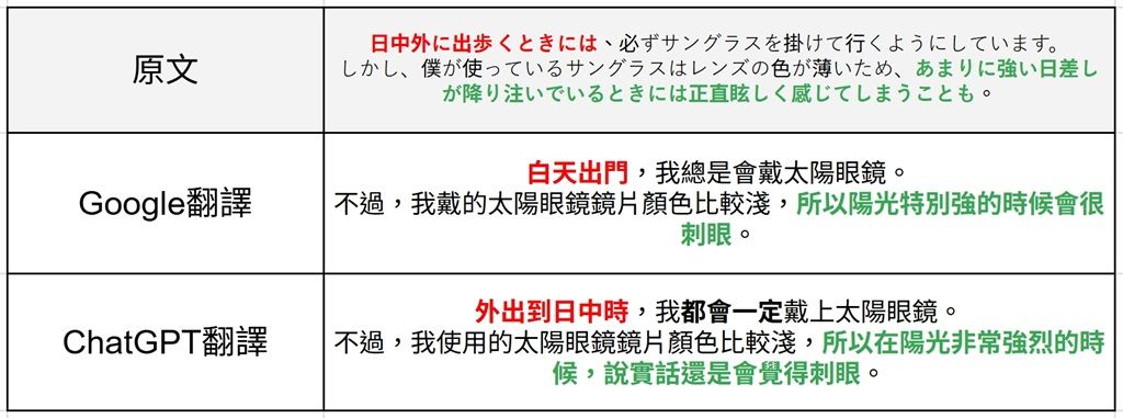 ▲在這個例子上,ChatGPT翻譯雖然內容正確,但Google翻譯更貼近原文想要強調的重點。