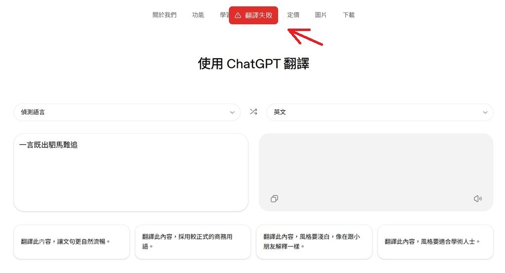 ▲ChatGPT翻譯容易出現錯誤訊息。特別的是,使用無痕模式會比較穩定。