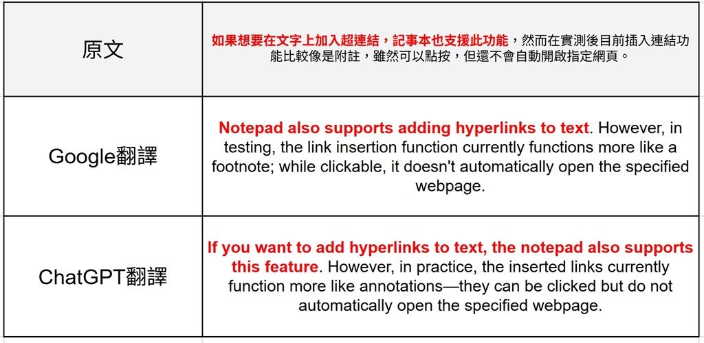 然而,Google翻譯和ChatGPT在文句語氣的選擇上仍然有些許差異,例如Google翻譯偏向文書風格,用字遣詞類似嚴謹的報導、論文,而ChatGPT翻譯較為口語,有可能會為了口語化稍微改動文句的順序或標點符號位置。另外ChatGPT翻譯偶爾會出現語句不通順或是贅詞,雖然不影響理解,但整體仍然不如Google翻譯準確。