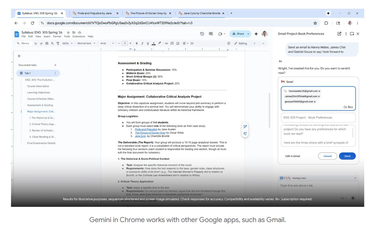 除了可與Google本身的服務串接以外,Chrome也透過Google與包括Shopify、Etsy、Wayfair、Target等共同制定的Google通用商務協議UCP標準,確保Gemini能夠在Chrome無縫作為用戶的代理人執行任務。Google的測試人員也活用自動瀏覽執行包括進行預定、填寫線上表單、收集稅務資料、獲取修繕工人的資訊與報價、檢查是否繳納帳單、管理訂閱的服務等等。