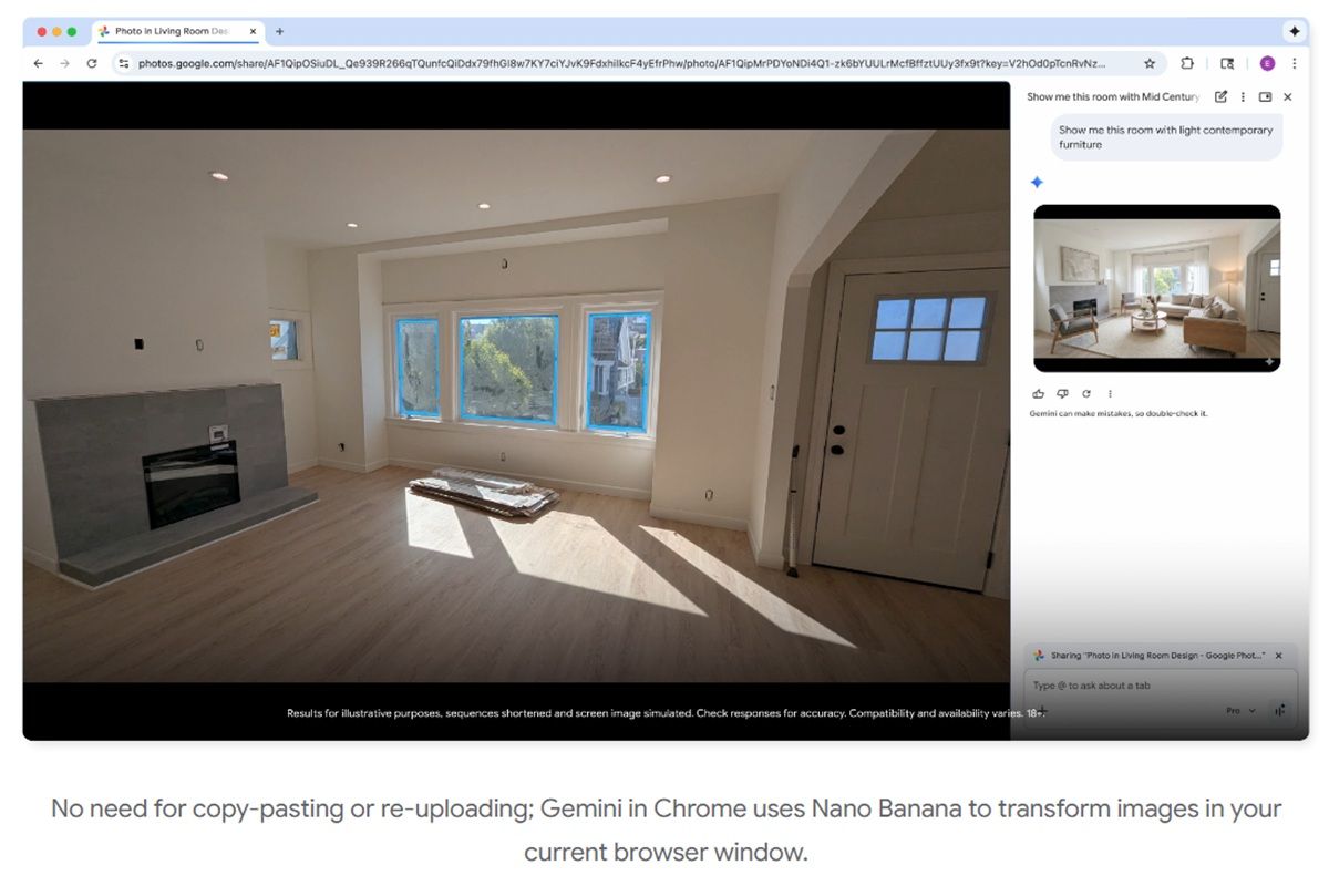 此外,透過側邊欄工具,在Chrome瀏覽器使用Nano Banana也變得更容易;不同於現行須把圖片另存再上傳到Gemini網頁版,透過側邊欄叫出Gemini,可以直接下指令要求Gemini讀取分頁的圖片並透過Nano Banana產生各種圖表,無論是模擬房間的裝修,或是把數據轉換成圖表,只要指令下的正確就能快速完成。