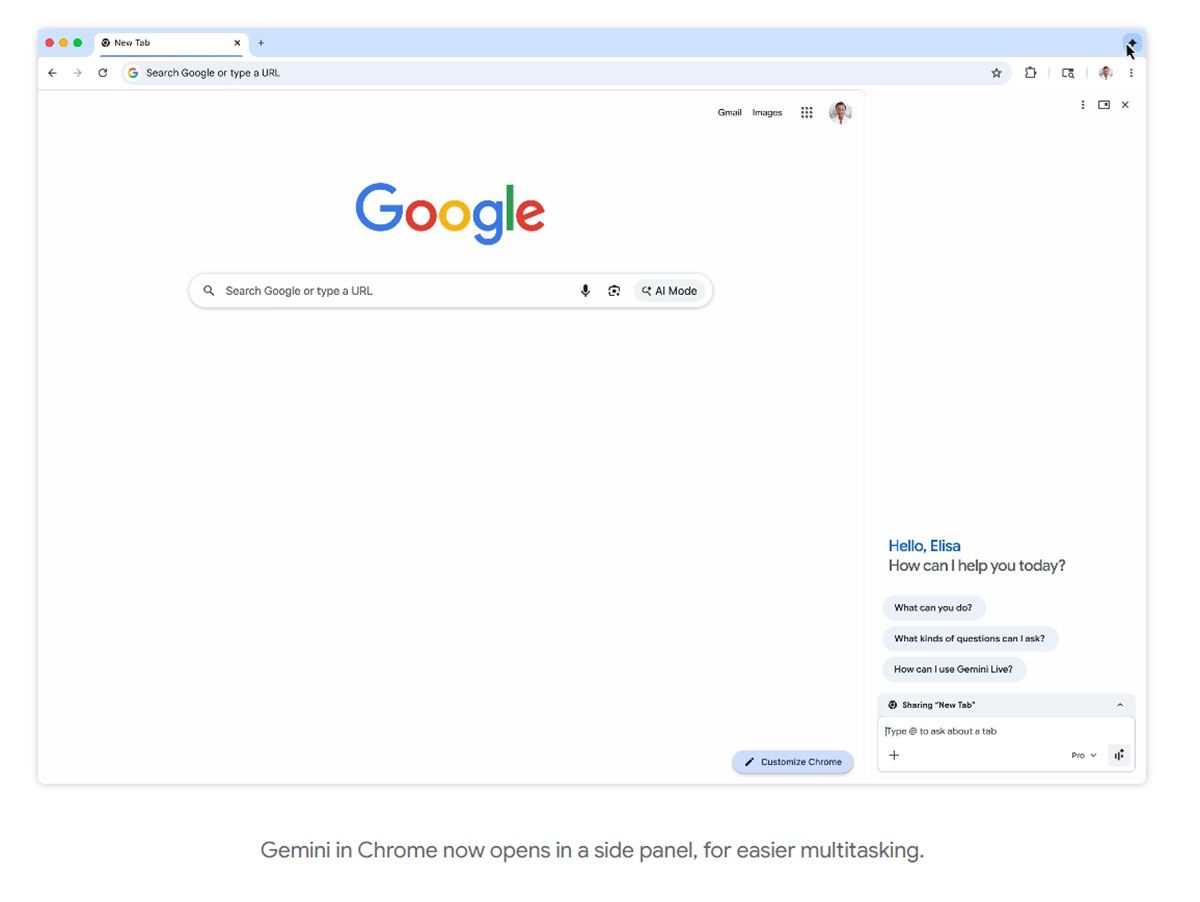 不同於目前在PC瀏覽器使用Gemini需要開啟獨立網頁,且僅限在Gemini網頁分頁內使用功能,新版Chrome將透過導入側邊欄設計,讓用戶無論在哪個Chrome分頁都可喚出Gemini工具探索頁面的內容,Google強調測試人員已經驗證過包括在多個分頁進行比較、彙整不同網站的產品評論,以及藉由存取Google日曆安排合適的行程時間等使用方式。