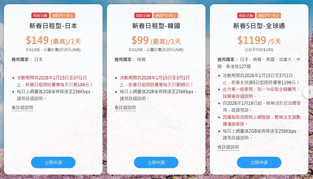 ▲中華電信網路門市限定國際漫遊優惠,即日起至3月31日,日本新春日租型方案每日最高149元、韓國新春日租型方案每日最高99元。圖片來源