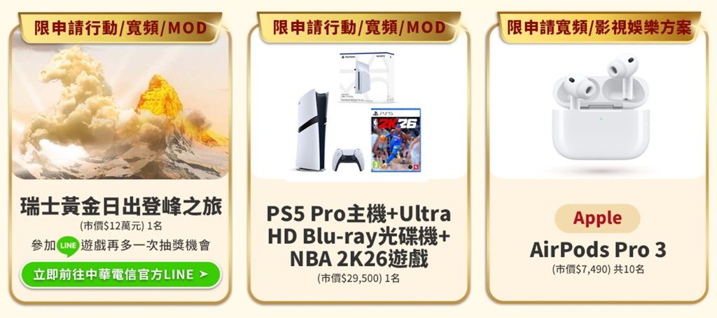 中華電信推出「一馬當先,好運衝峰」活動,即日起至2月20日止,用戶於網路門市申辦行動網路、光世代或MOD服務,將可獲得多項好禮的抽獎機會,獎項包括價值12萬元的瑞士馬特洪峰黃金日出登峰之旅、價值近3萬元的PS5 Pro遊戲主機與遊戲組合包等。而若是用戶新申辦或升級光世代或Hami Video影視娛樂方案,可再抽AirPods Pro 3。