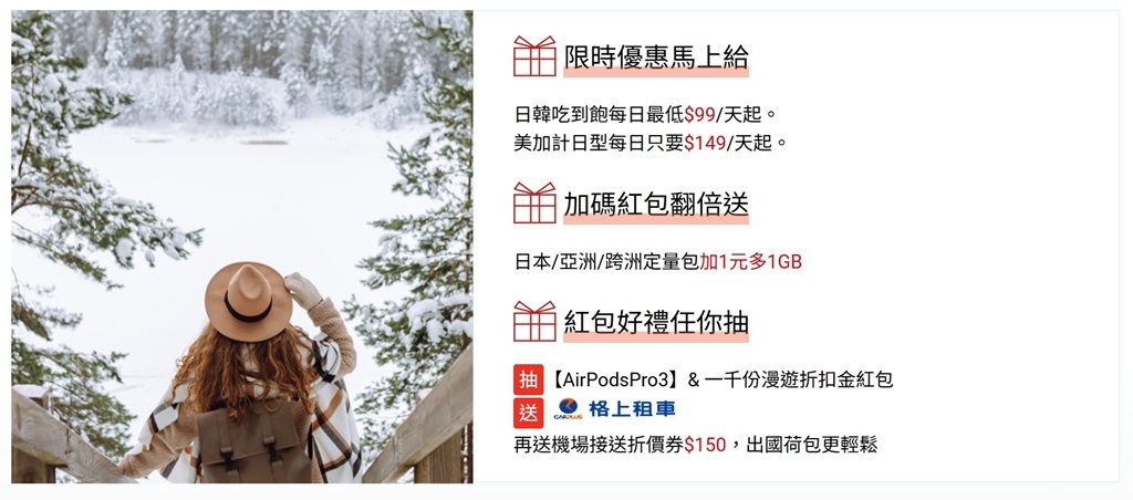 至2月28日,國際漫遊日本、亞洲、跨洲定量包指定方案加1元多1GB。