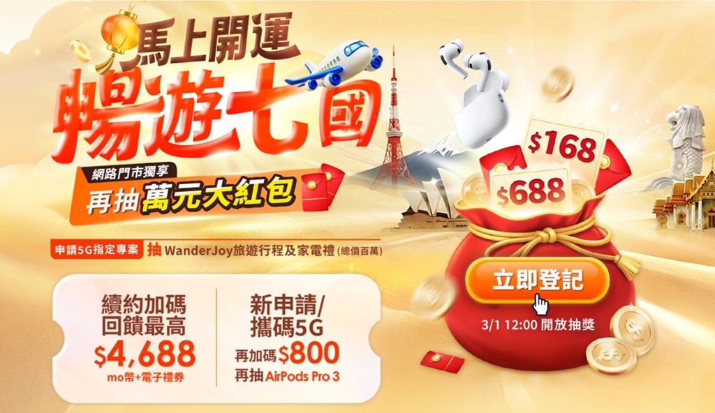 至2月28日,月租用戶申辦國際漫遊並成功啟用,抽AirPods Pro 3等禮品。