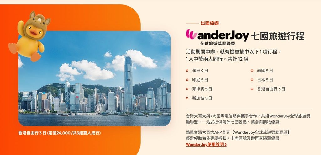 2025年2月台灣大哥大推出多項抽獎活動,例如即日起至2月28日止,用戶新申辦、攜碼、續約申辦台灣大哥大5G網路月繳999元以上,前往活動網頁登記後,將有機會抽中Wanderjoy 7國旅遊行程和家電禮品。其中旅遊行程獎項包括日本5日、泰國5日、澳洲9日、香港自由行3日等,1人抽中2人同行,總計將抽出12名得獎者。